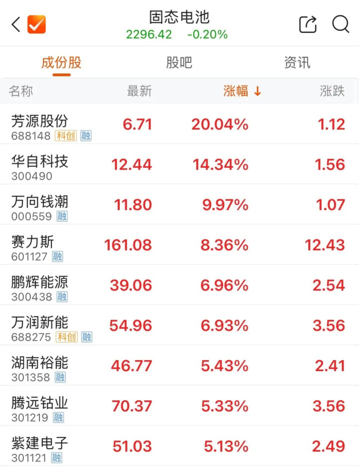 盘初,固态电池板块再度活跃,芳源股份开盘4分钟后,封上“20cm”涨停。截至午间收盘,华自科技涨超10%,万向钱潮涨停。