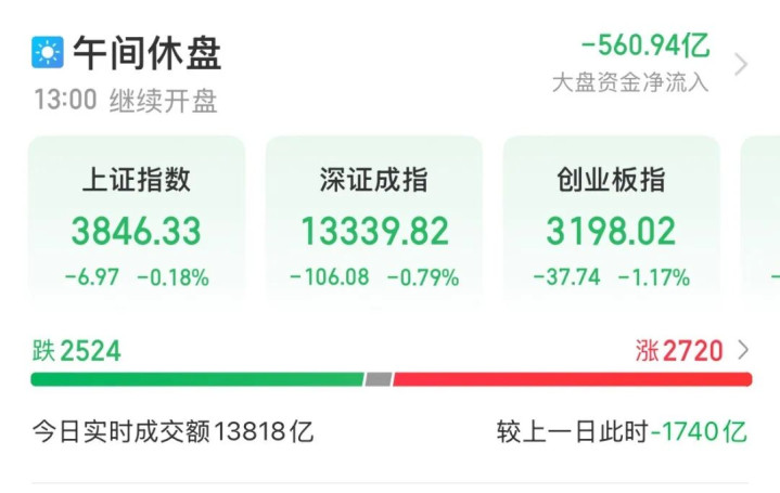 9月26日早盘,A股三大指数低开震荡。截至午间收盘,上证指数报3846.33点,跌0.18%;深证成指、创业板指分别跌0.79%、1.17%。沪深北三市半日成交13818亿元,立讯精密、赛力斯、阳光电源成交额均超百亿元。