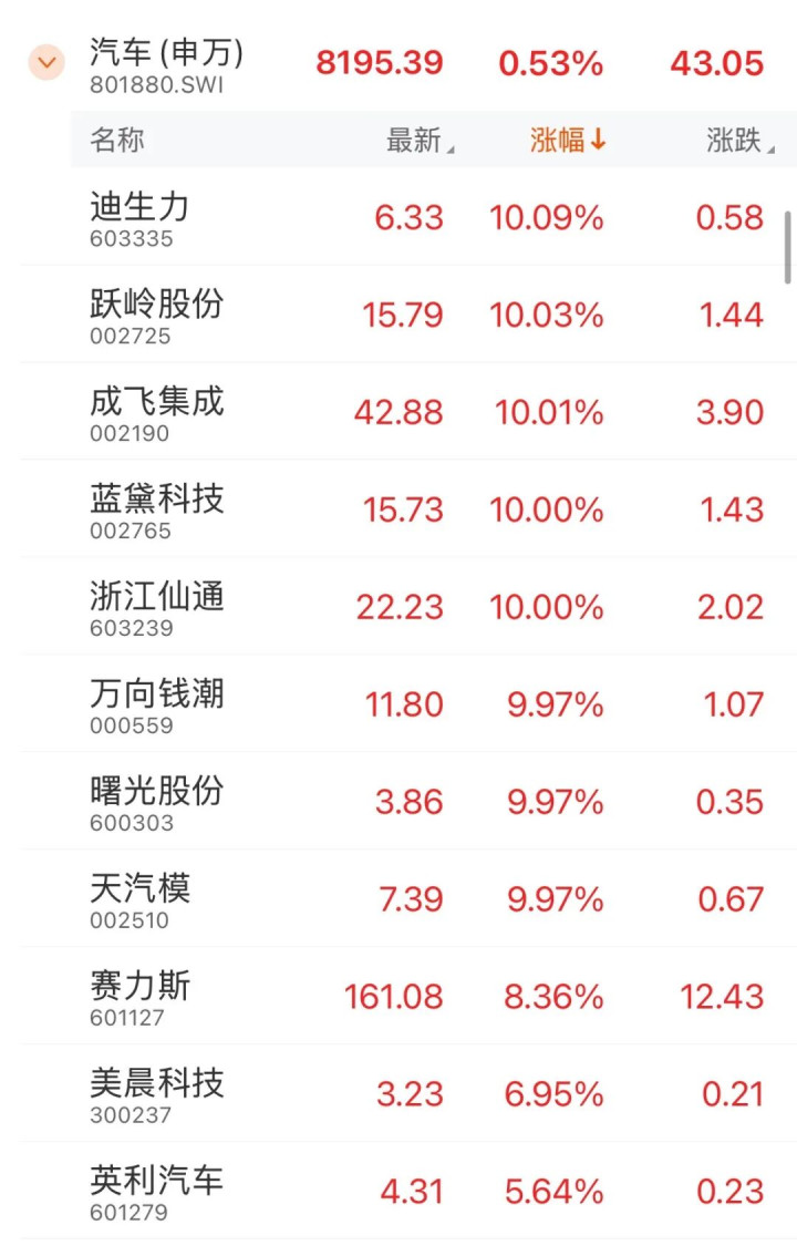 在多重利好叠加催化下,汽车概念股今日早盘震荡走强,赛力斯盘中一度触及涨停,股价创历史新高。截至午间收盘,迪生力、跃岭股份、曙光股份、蓝黛科技等多只个股涨停。